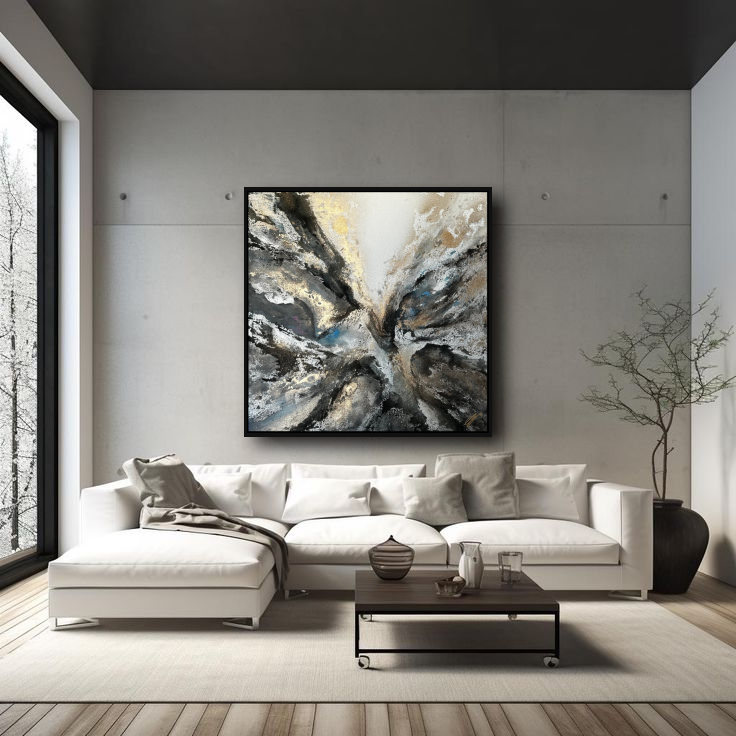 Dimensions of canvas: 100 x 100cmMedium: Mixed media and satin finish Black L-shaped frame included Price: €1,500.00